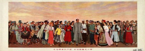 Somewhat more disturbingly, the painting is highly suggestive of Maoist propaganda posters, especially the ones where the Great Helmsman is surrounded by hundreds of cheerful, energetic and well-fed looking Chinese people representing various ethnicities and acceptable segments of proletarian society. For example:
