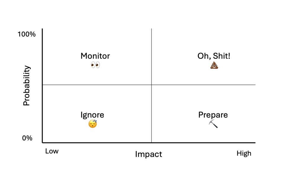 But it’s a useful heuristic. Alien invasion? High impact! Vanishingly small probability. Don’t worry about it. If it happens, no one will blame you for not having a comms plan and your boss will be too busy fleeing to his luxury bunker in Big Sur with a suitcase full of ketamine to give you a hard time.